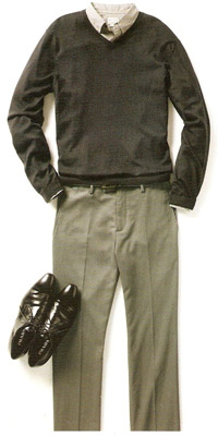 Отход от корпоративного стиля В сочетании с рубашкой и свитером серые брюки не выглядят скучно и воплощают классический и расслабленный стиль. |
