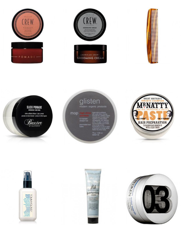 Средства для укладки Вам не следует сильно сушить волосы для того чтобы применять эти средства для укладки. Сухие волосы создадут совершенно ненужный объем, с которым потом будет трудно бороться. Вытрете голову полотенцем и нанесите помаду для волос, мы рекомендуем - American Crew, для того чтобы придать средний и сильный эффект блеска и зафиксировать прическу. В первое время Вам будет нелегко: так мы очень давно не укладывали волосы средствами придающими эффект блеска. Совет: всегда начинайте с небольшого количества средства и с боков головы.