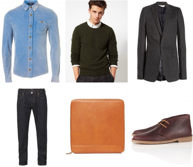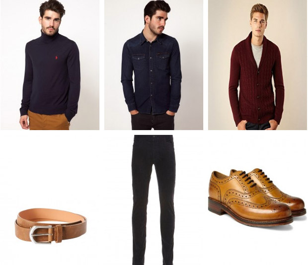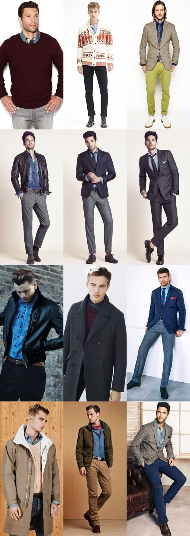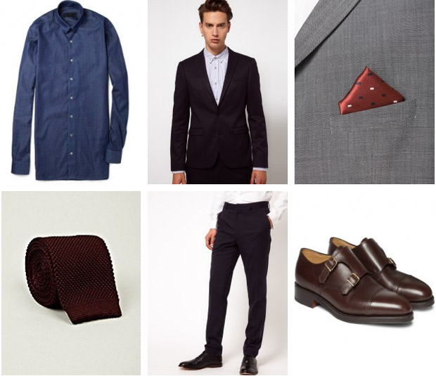 Look 1 С одной стороны, самый простой, но, на наш взгляд, и самый утонченный образ, возможно создать сочетанием синего костюма со светло-голубой джинсовой рубашкой. Подберите темно-коричневый или бордовый вязаный галстук и вы создадите изысканный и солидный look. Ботинки должны быть также темно-коричневого цвета.